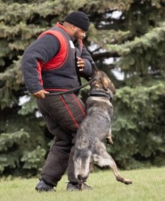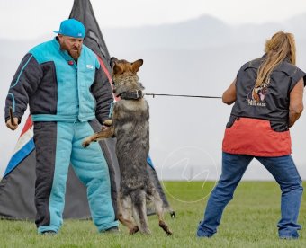 Enjoys protection work and demonstrates great power through full strong grips for a very young dog. Very deap and strong barking when on guard.